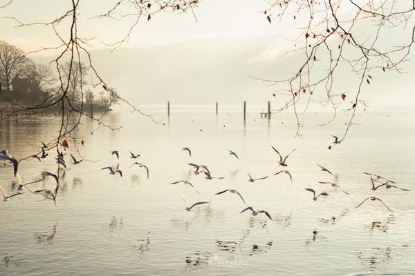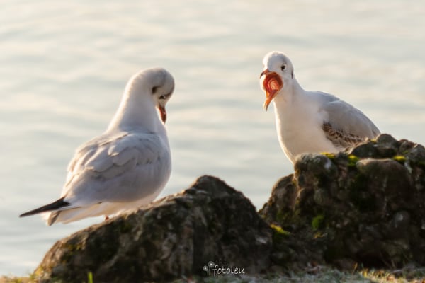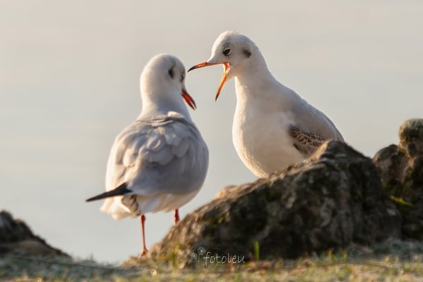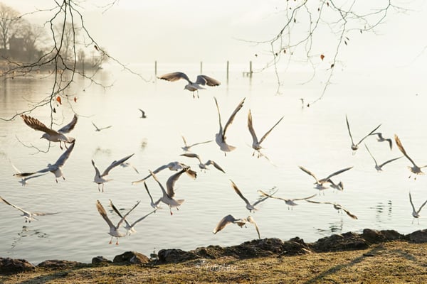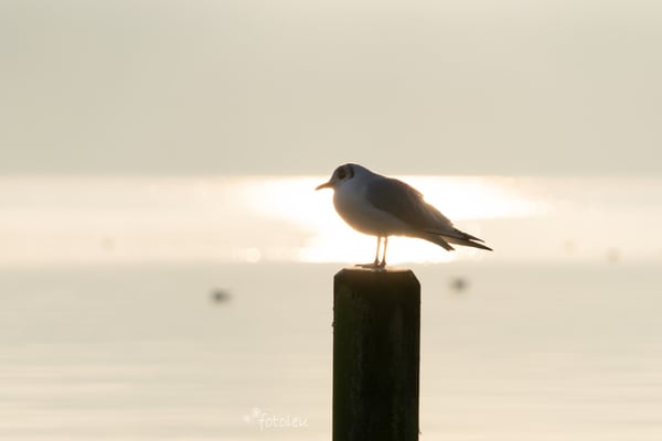 was ist den da los? Da "schimpft" der eine Vogel mit dem anderen so fest, dass er den Kopf schon eingezogen hat. Jetzt tut er mir schon fast leid, immer wieder von neuem hat er "geschimpft", ich ging recht nahe ran, auch das störte ihn gar nicht. Plötzlich kamen "seine"? "ihre"? Vogel-Freunde, ich denke auch die hatten genug vom Streit. Sie flogen zusammen los, richtung See hinaus so als wäre nichts gewesen. Total frei und fröhlich sah das aus. Mit einem schmunzeln ging ich den Weg zurück. Was für ein Morgengruss.